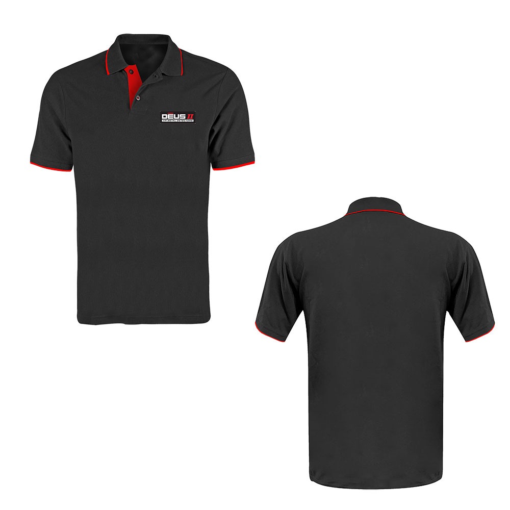 NEW Stylish, black XP Polo Shirt with rubber patch DeusII logo on the front.